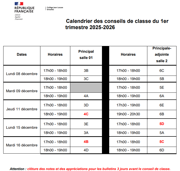 ATTENTION les dates des Conseils de Classe des 4C et 4B ont été changées !